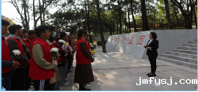 抵达目的地后,同学们跟随文琼瑶老师来到烈士英雄纪念碑下献花,表达对先烈的怀念和敬仰。随后,全体人员合唱团歌《光荣啊!中国共青团》,将无限哀思化作坚定的信念,献给敬爱的先烈,唱歌结束后,文琼瑶老师带领团员们来到烈士陵园的英名碑前,全体肃立默哀,寄托对先烈的无限敬意和绵绵哀思。